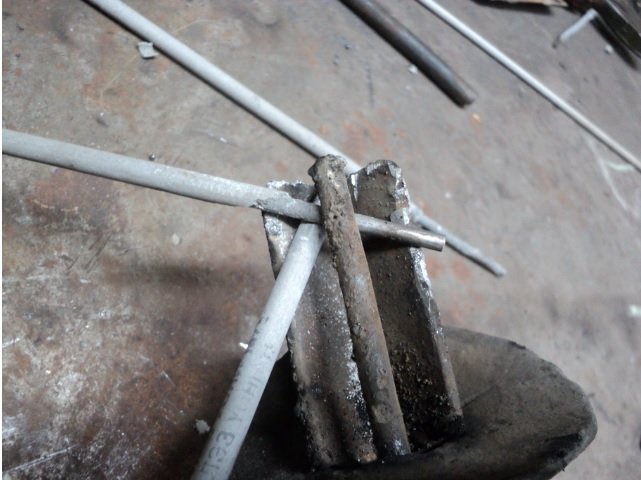 Тело держака (трезубец) делают путем гибки арматуры (или прутка), изготовленной из углеродистой стали, диаметром 8 мм ( можно 6 мм, но быстро прогорает, можно взять диаметр >8мм). Как показывает опыт, восьмерки и надольше хватает и ей удобней работать.